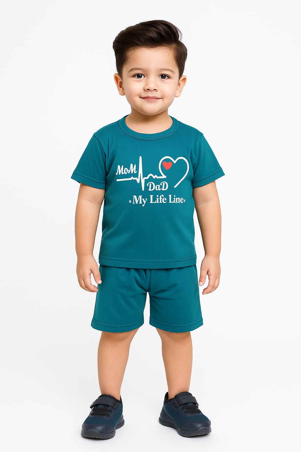 Dress your little one in comfort and style with this 2-Piece Kids Suit, designed for boys aged 1–6 years. Made from premium jersey fabric, this set includes a printed T-Shirt with the text “Mom Dad My Life Line” and a matching comfortable nicker (shorts).